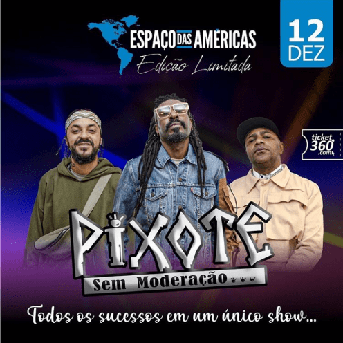 Um dos grupos de Pagode mais amados do Brasil, retornam ao palco do Espaço Das Américas no dia 12 a partir das 21h. Com o show “Sem Moderação”, o Pixote chega com um repertório cheio de sucessos, que embalaram os fãs nestes 27 anos de carreira