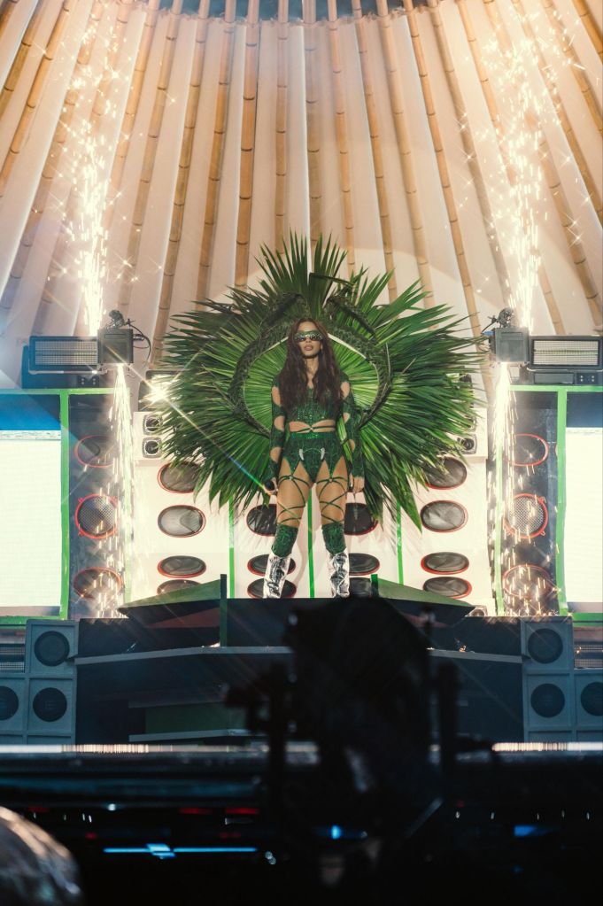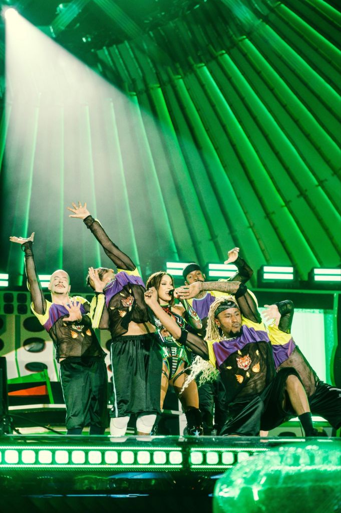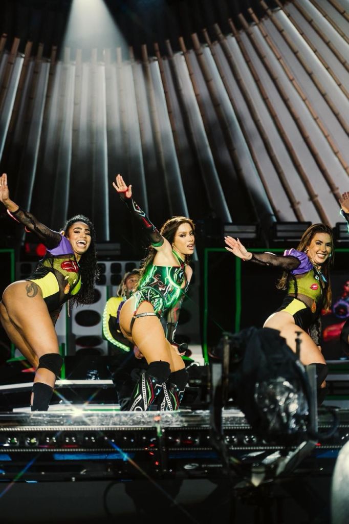 Na cenografia em tons neon, o clima era de memórias afetivas tipicamente brasileiras, com referências aos bailes risca-faca e aos ritmos românticos e brega. “Acho que esse diálogo entre passado e presente é muito importante na nossa cultura, porque a gente reafirma a nossa identidade quando celebra as referências que nos formaram. Eu cresci no subúrbio, na periferia do Brasil… Esse momento do show tem referências culturais super afetivas dos bailes e festas dessas regiões”, explica Anitta.